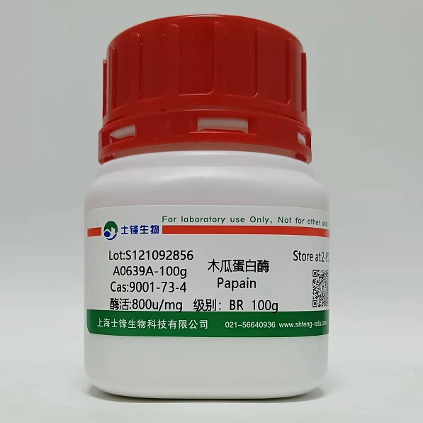 性状(以下信息仅供参考):白色至淡黄色粉末。一种能水解多肽、酰胺和酯的酶。其分子由212残基的折叠多肽键组成。微有吸湿性。对光敏感。不完全的溶于水和甘油,几乎不溶于多数有机溶剂。酶反应:裂解Arg-、Lys-、Phe-、X氨基酸。模型底物为苯甲酰精氨酸乙酯(BAEE)、N-苯甲酰-L-精氨酸对硝基苯胺(N-α-Bz-L-Arg-4-NA)、苄氧羰酰缬氨酰甘氨酰精氨酸对硝基苯胺(Chromozym TRY)。激活剂有半胱氨酸(Cys)、谷胱甘肽(GSH)、EDTA、还原剂、氰化物。抑制剂有汞(Hg2+)、其他重金属、碘乙酸、N-对基顺丁烯二酰亚胺(NEM)、苯甲基磺酰氟(PMSF)、N-对甲苯磺酰-L-苯丙氨酸氯甲基酮(TPCK)、对甲苯磺酰-L-赖氨酸氯甲基酮(TLCK)