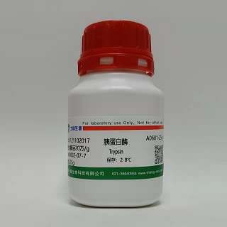 性状(以下信息仅供参考):由猪胰提取而得的一种肽链内切酶,淡黄色粉末。不溶于乙醇、甘油、氯仿和乙醚。等电点pI 10.5。Ca2+对酶活性有稳定作用;重金属离子、有机磷化合物、DFP、天然胰蛋白酶抑制剂对其活性有强烈抑制。