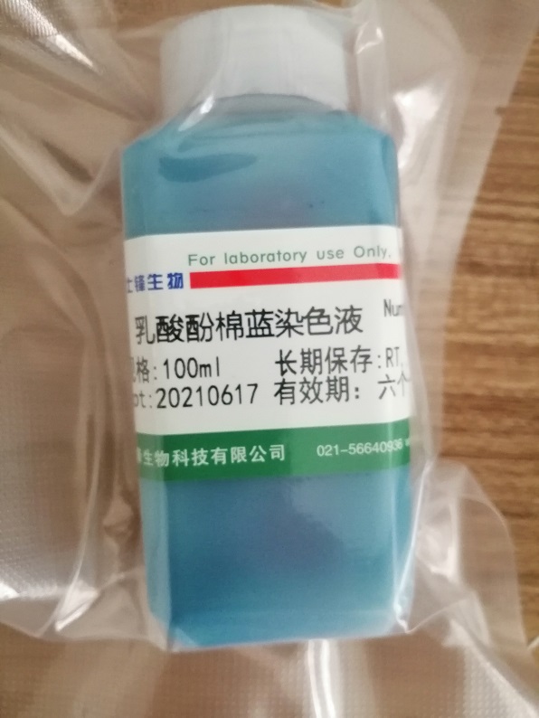 滴乳酸酚棉蓝染色液,用解剖针从霉菌菌落的边缘外取少量带有孢子的菌丝置于染色液中,再细心地将菌丝挑散开,然后小心地盖上盖玻片(加热或不加热),注意不要产生气泡。置显微镜下先用低倍镜观察,必要时再换高倍镜。